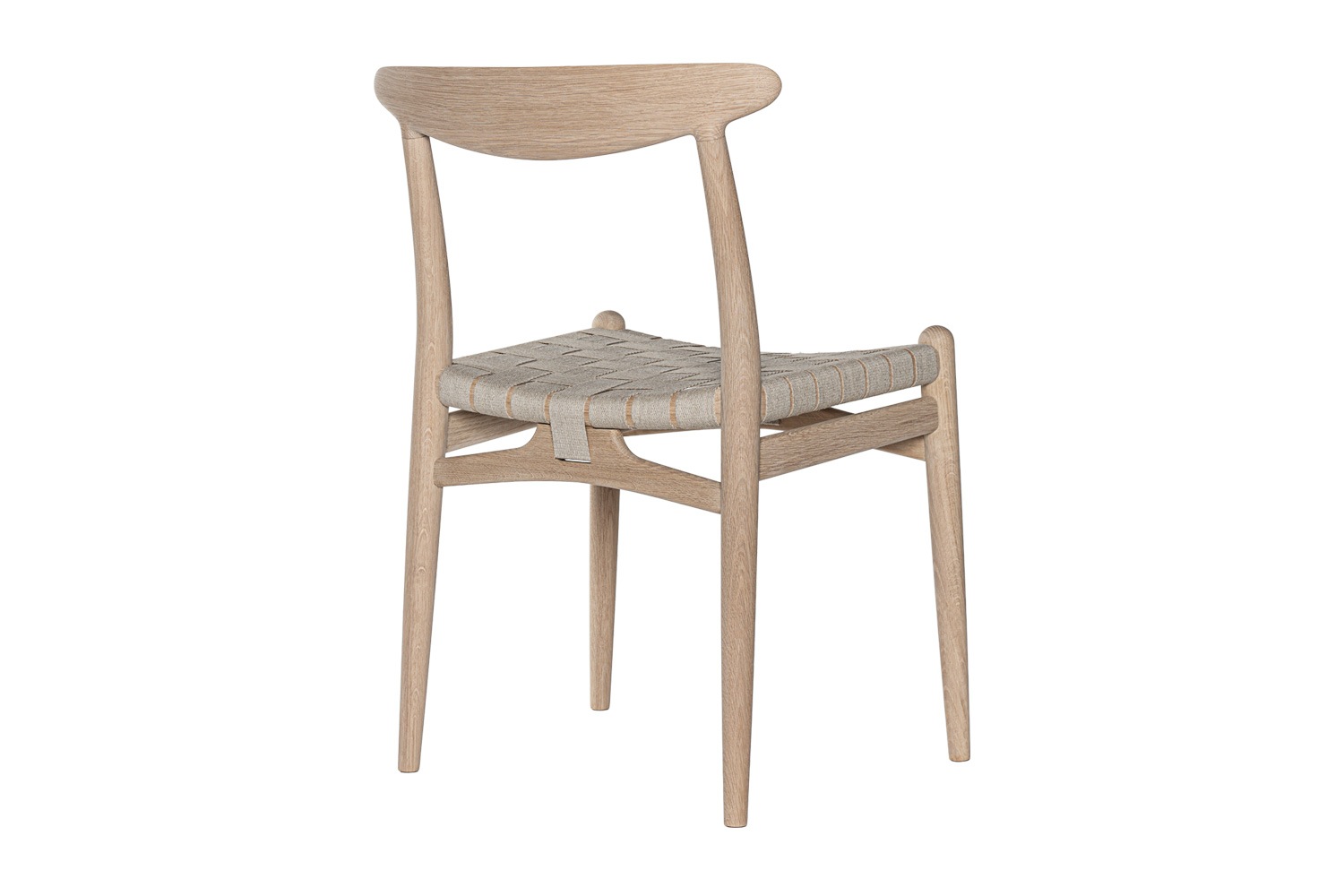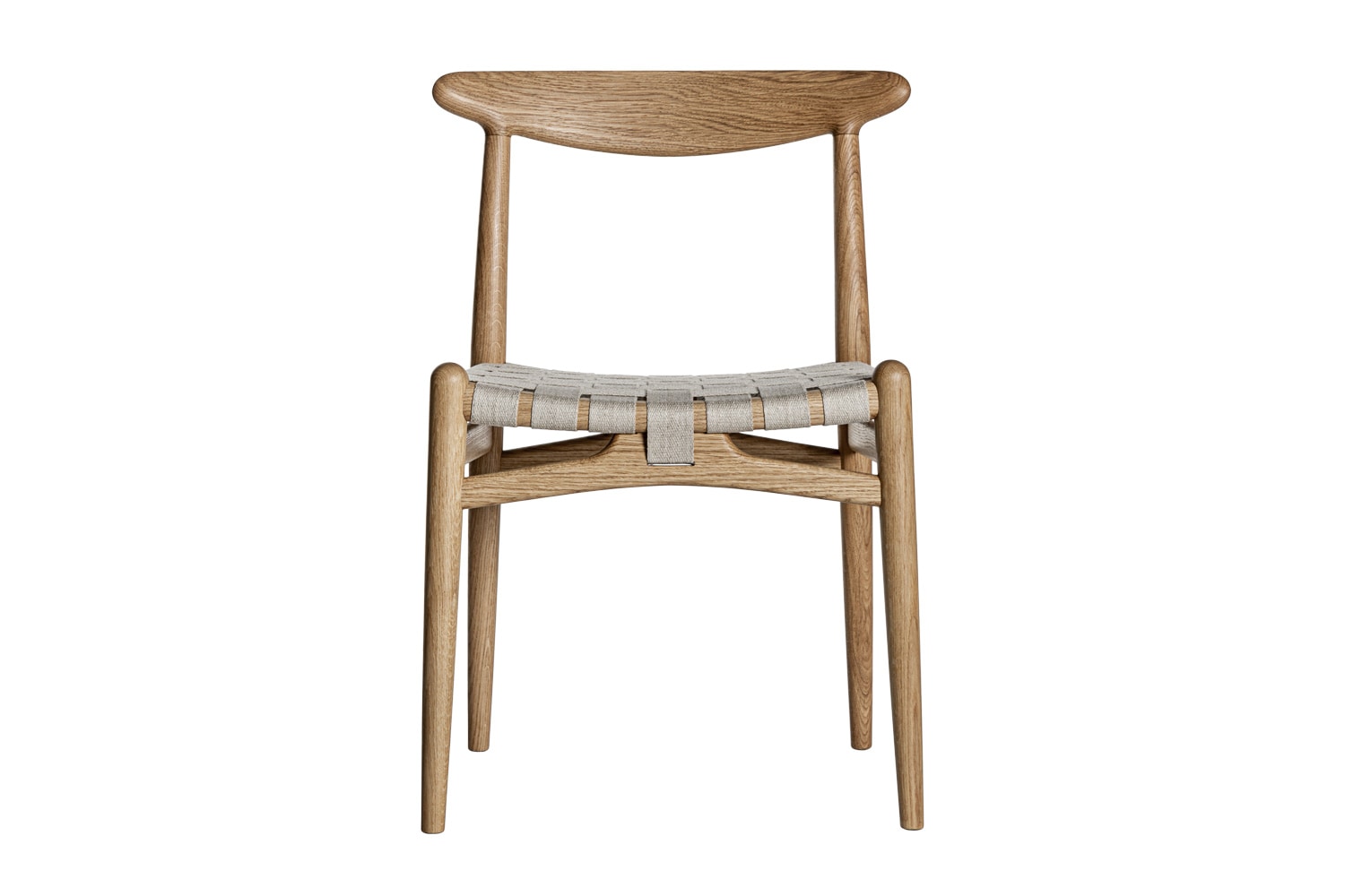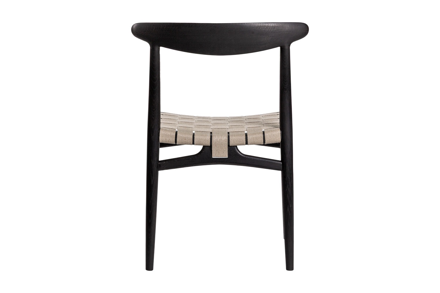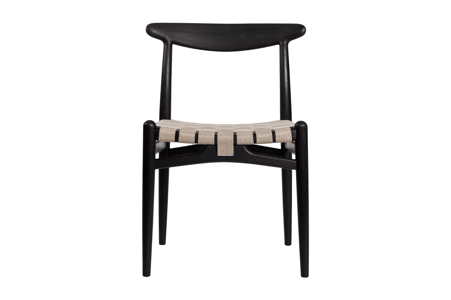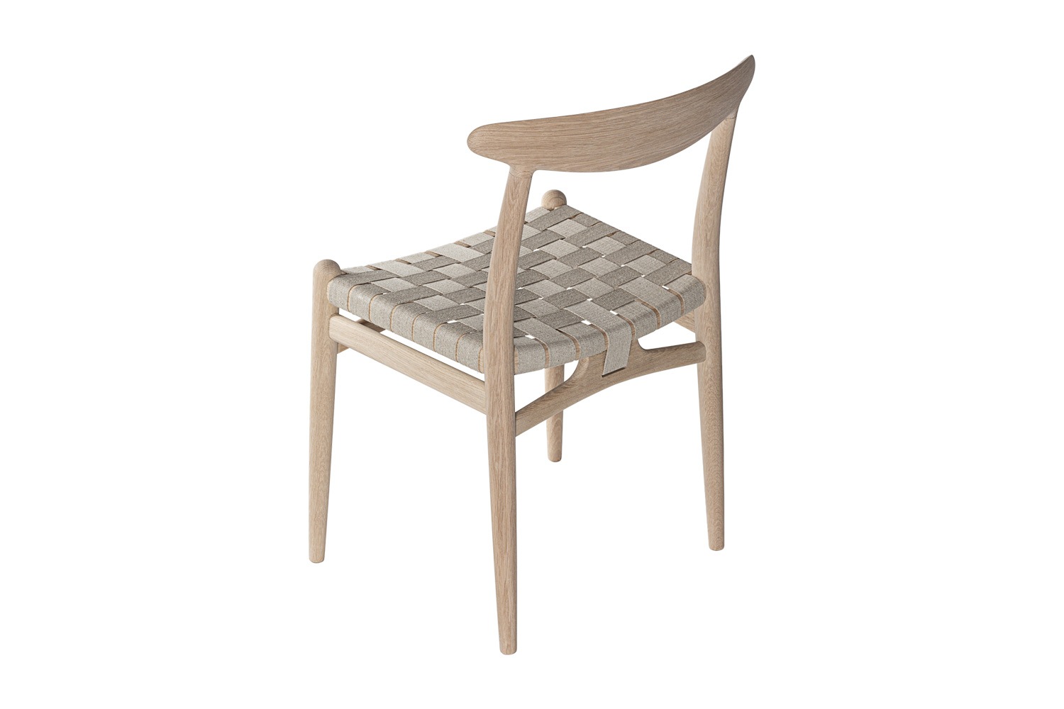 PP101チェアは、水平にカーブした背もたれや、リネンのウェビングで手織りされた座面、ウェビングの張力を維持するためにデザインされた優美なフロントレールが特徴的。ウェグナーの、プロポーションやディテールへのこだわりが見て取れます。