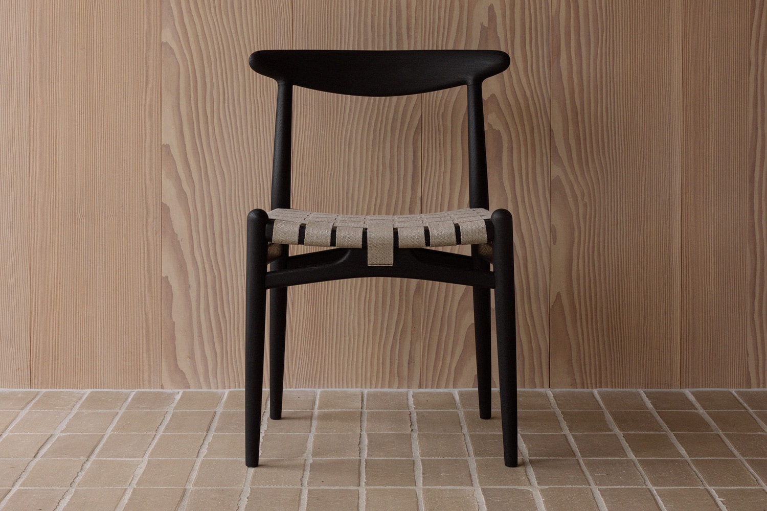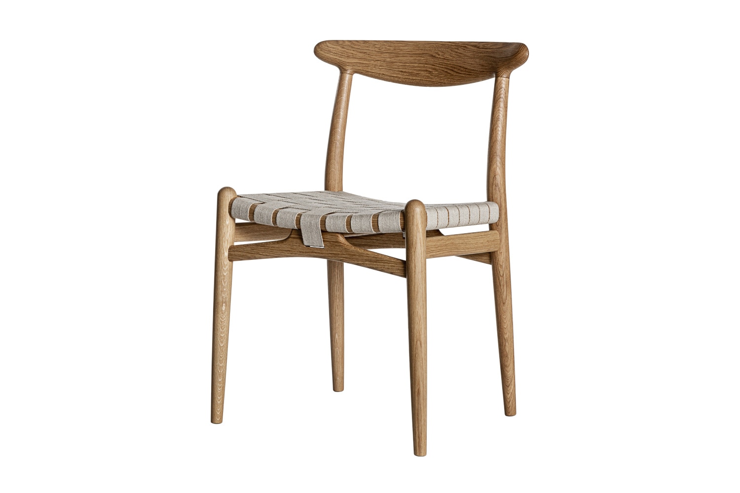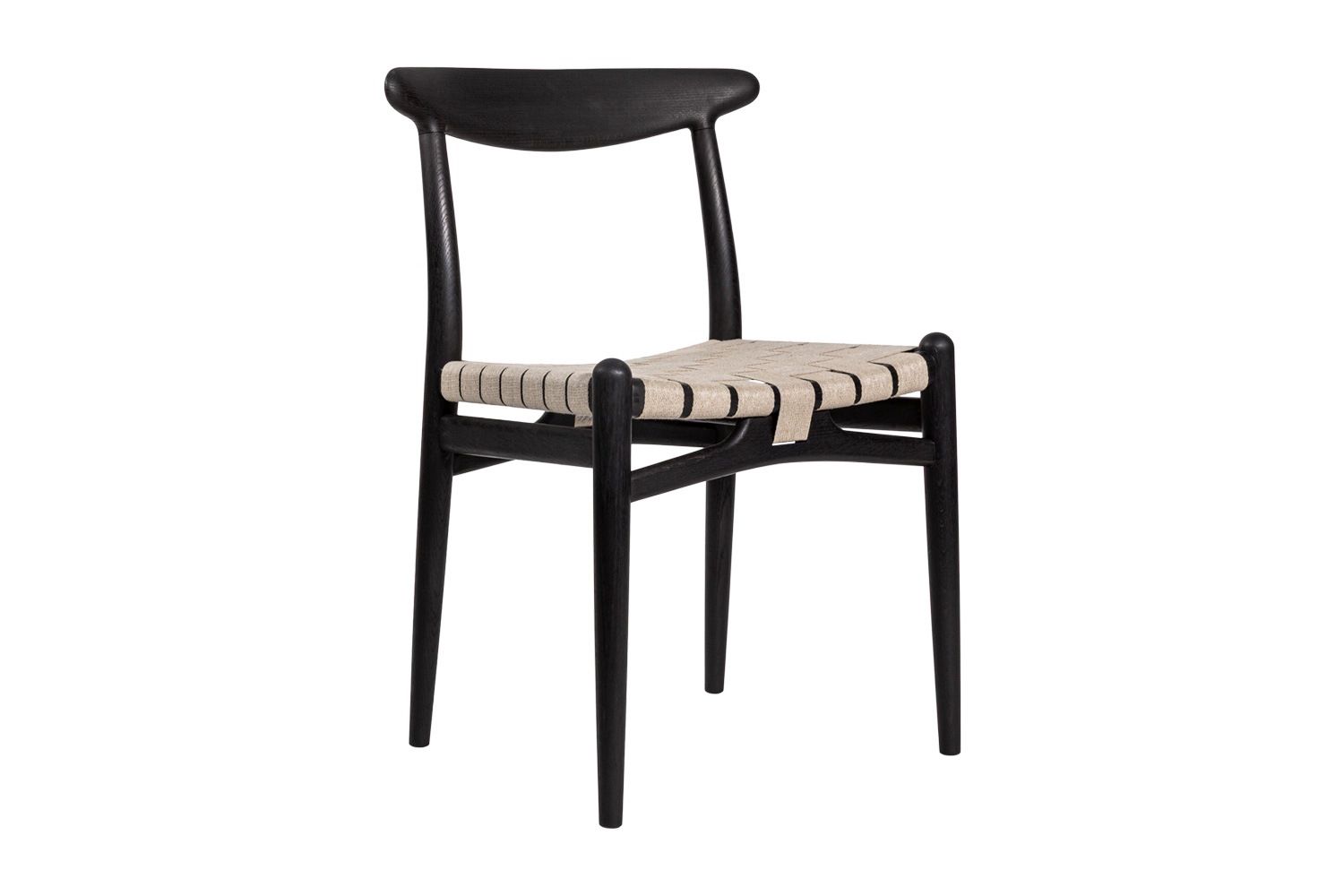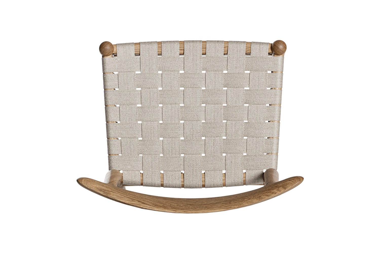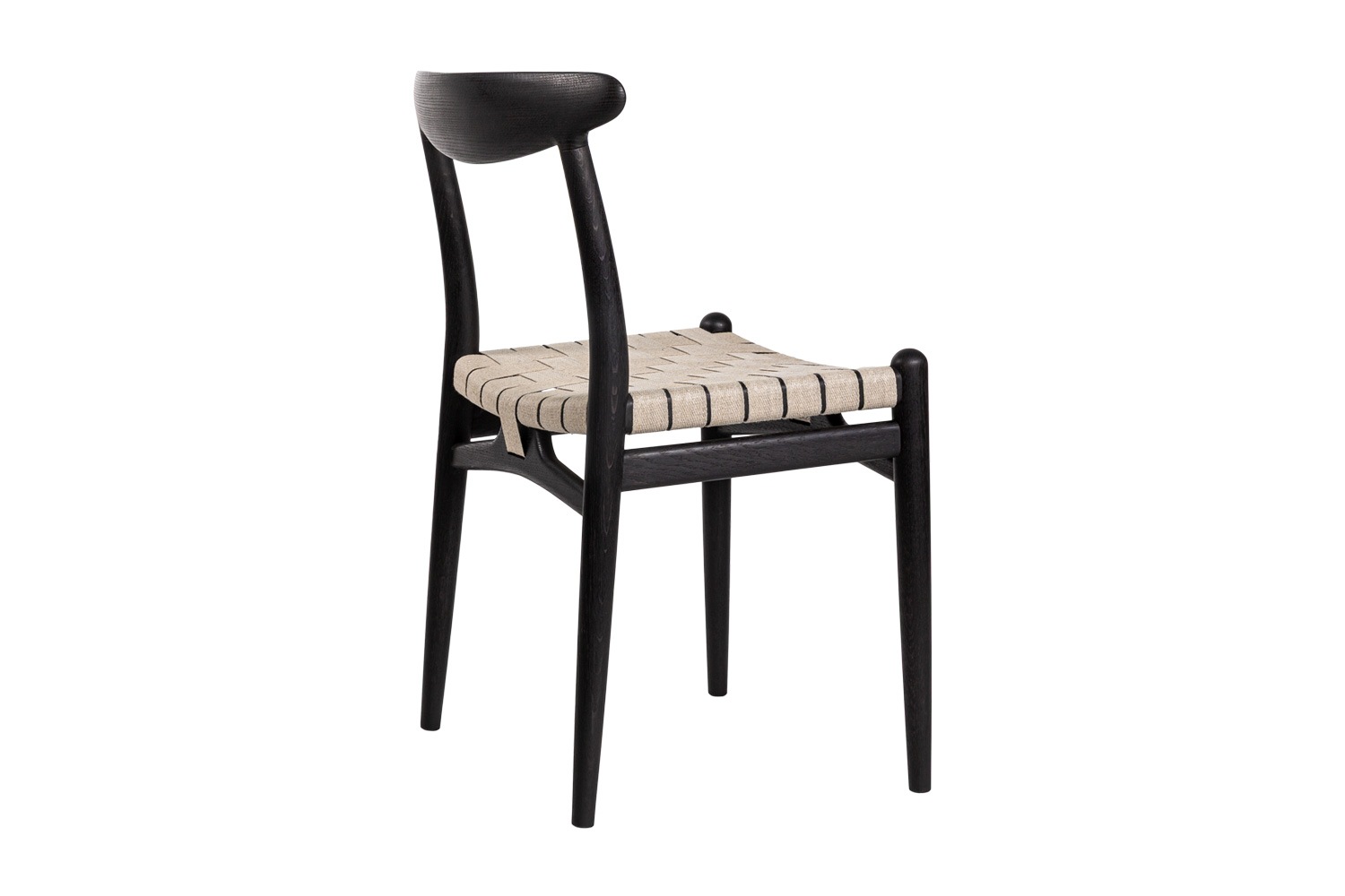 PP101チェアは、水平にカーブした背もたれや、リネンのウェビングで手織りされた座面、ウェビングの張力を維持するためにデザインされた優美なフロントレールが特徴的。ウェグナーの、プロポーションやディテールへのこだわりが見て取れます。