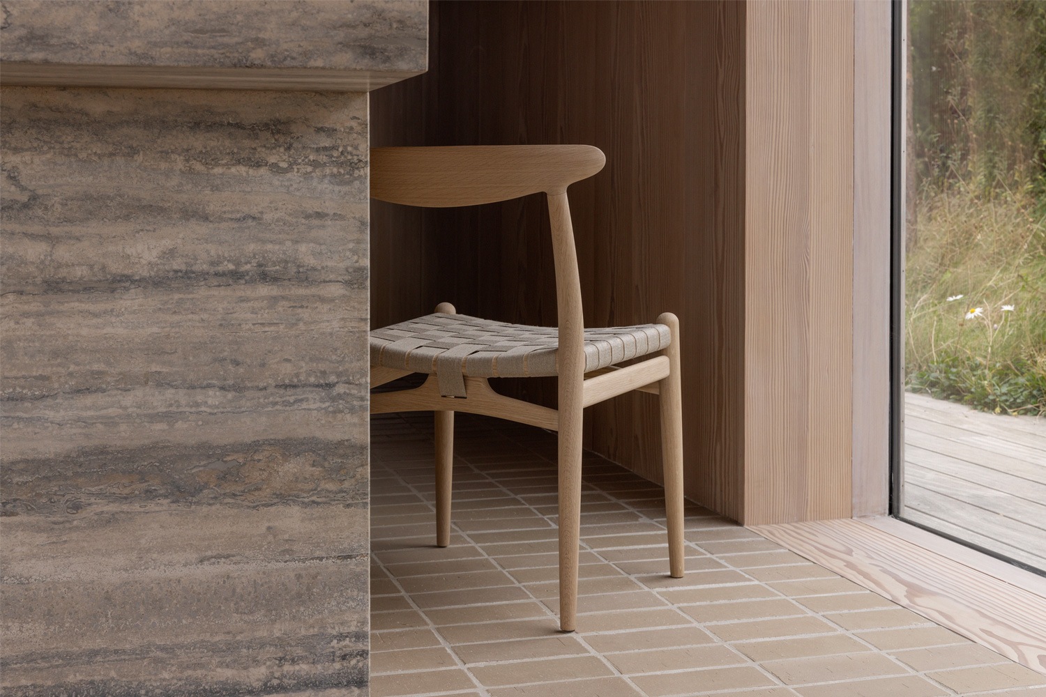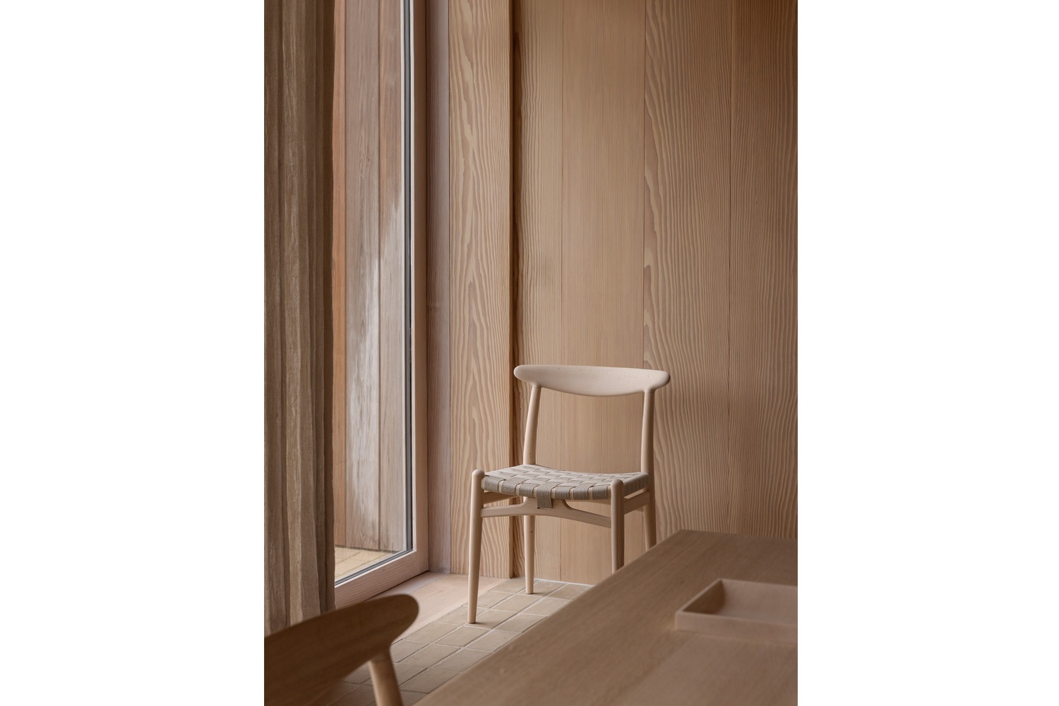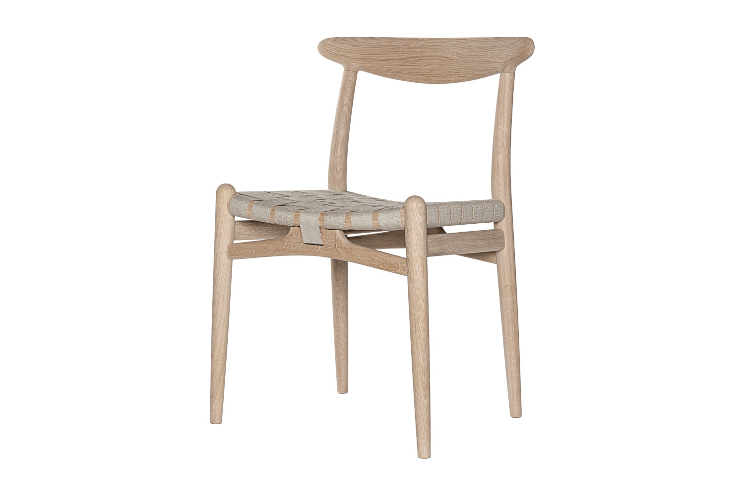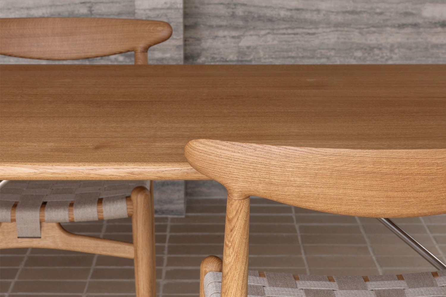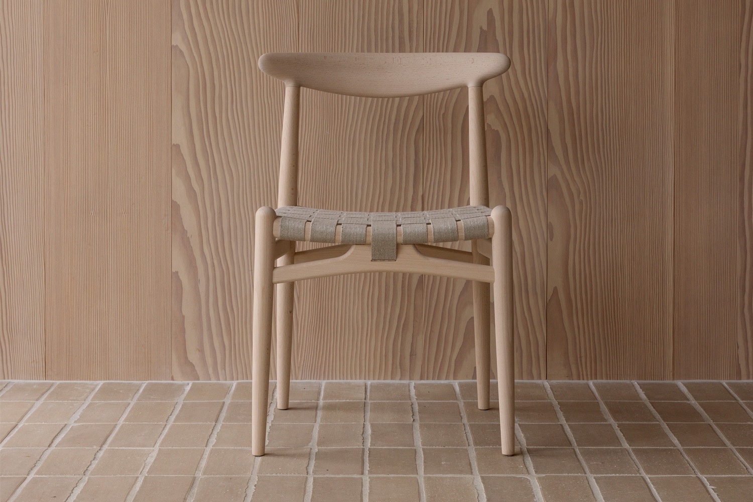 PP101チェアは、水平にカーブした背もたれや、リネンのウェビングで手織りされた座面、ウェビングの張力を維持するためにデザインされた優美なフロントレールが特徴的。ウェグナーの、プロポーションやディテールへのこだわりが見て取れます。
