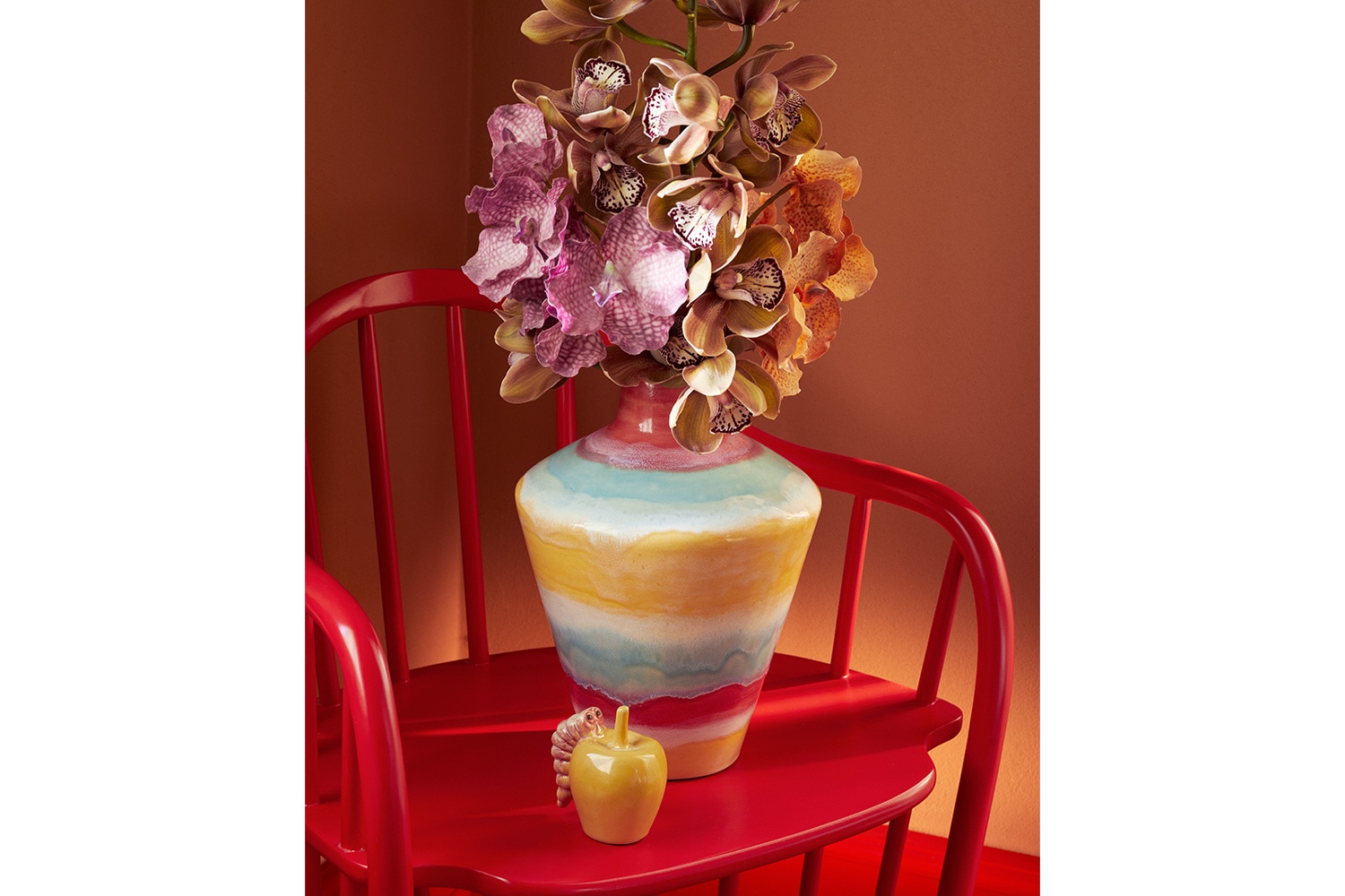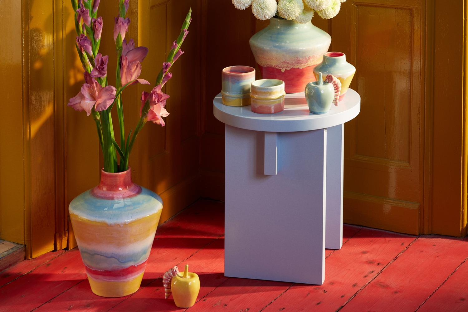 デンマークの陶磁器ブランドKÄHLER(ケーラー)と、コペンハーゲンを拠点に活動するデザインデュオKIMPOP(キムポップ)によって生まれたPoppery(ポッペリー)シリーズ。 伝統あるクラフトマンシップに、 大胆な色彩と遊び心が重なり合い、 花を活ける器という枠を超えた“オブジェ”としての存在感を放ちます。